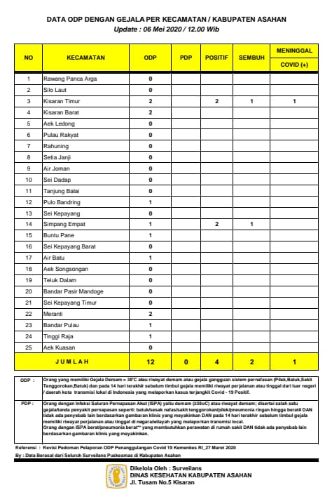 Kisaran – Tim Gugus Tugas Kabupaten Asahan melakukan update data terkait dengan penanganan pencegahan penyebaran Covid-19, hingga saat ini hasil yang diperoleh dibandingkan jumlah sebelumnya mengalami penurunan yang sangat signifikan Rabu (6/5/2020) sekira pukul 12.00 wib.