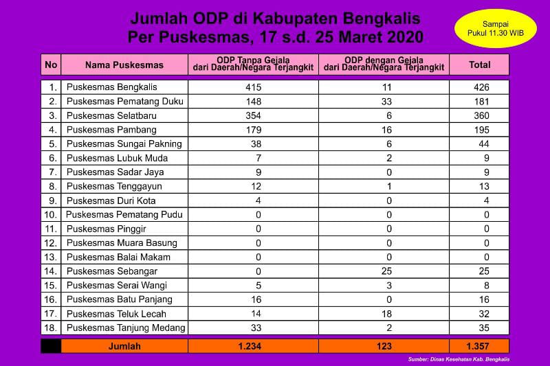 BENGKALIS – MANDIRI POS, Jumlah Orang Dalam Pemantauan (ODP) di Kabupaten Bengkalis dari 17 s.d. pukul 11.30 WIB, Rabu, 25 Maret 2020, berjumlah 1.357 orang.