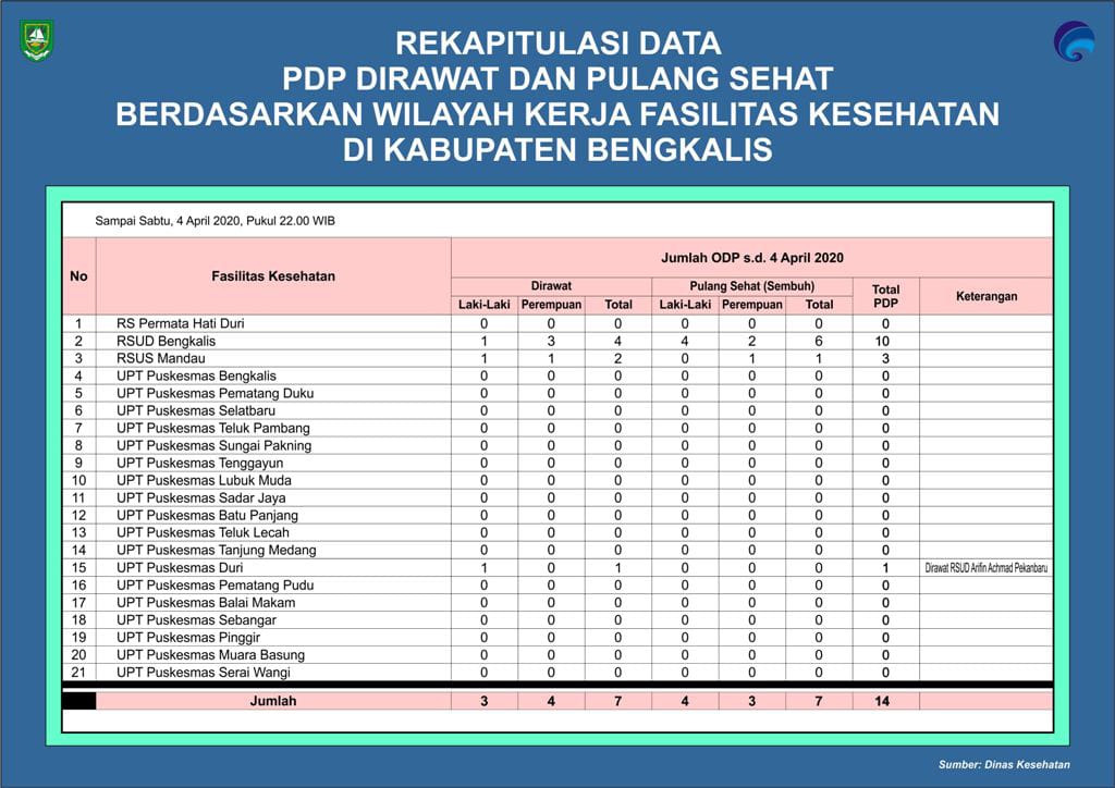Ke-7 PDP yang masih dirawat tersebut diantaranya 4 dirawat di RSUD Bengkalis, 2 di RSUD Mandau, dan 1 di RSUD Arifin Achmad Pekanbaru.