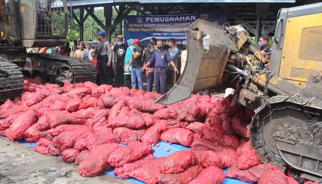 “Kepala Kantor Bea Cukai Bengkalis, Ony Ipmawan menjelaskan, sebelumnya Penyidik KPPBC Tipe Madya Pabean C Bengkalis mengajukan permohonan pemusnahan barang bukti berupa bawang merah dan telah mendapat penetapan pemusnahan dari Ketua Pengadilan Negeri Bengkalis Kelas II melalui Surat Penetapan Pemusnahan Nomor : 6/Sit/Pen.Pid/2020/PN.Bls tanggal 30 Juni 2020,” kata Ony Ipmawan.