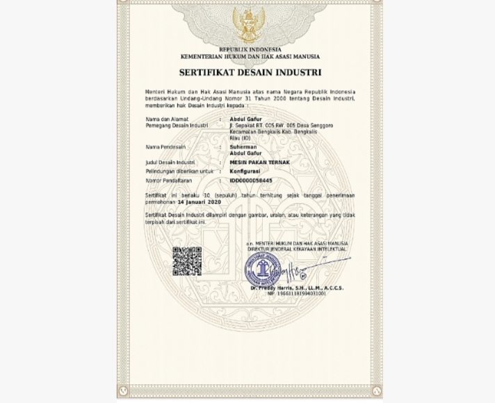 Lebih lanjut Johny menjelaskan bahwa penerbitan Sertifikat Desain Industri tersebut memakan waktu lebih kurang satu tahun sejak Mesin Pakan Ternak selesai didesain.