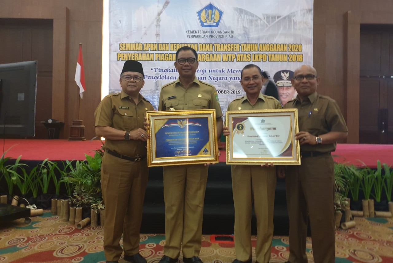 Atas raihan prestasi yang telah dicapai tersebut, pemerintah pusat yang diwakili menteri keuangan RI melalui Gubernur Riau, menyerahkan piagam penghargaan WTP atas LKPD tahun 2018 ke Pemerintah Kabupaten Rokan Hilir diterima langsung Bupati Suyatno.