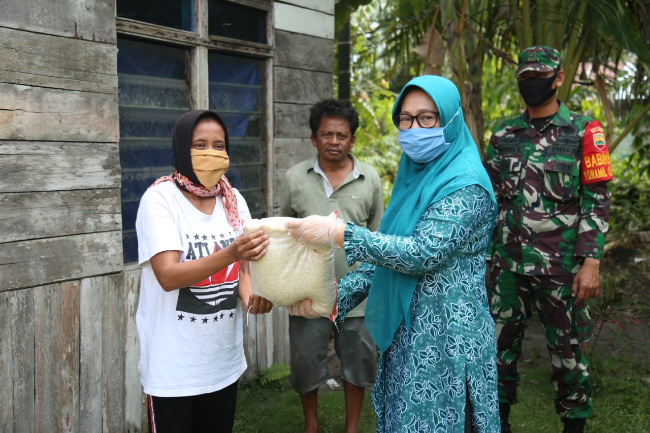 SIAK-Masdiana (60) warga Kelurahan Sungai Mempura tidak menyangka sekaligus terharu saat menerima bantuan sembako dan masker yang langsung diantar Ketua PKK Kabupaten Siak Rasidah Alfedri, Kamis (16/4/2020).