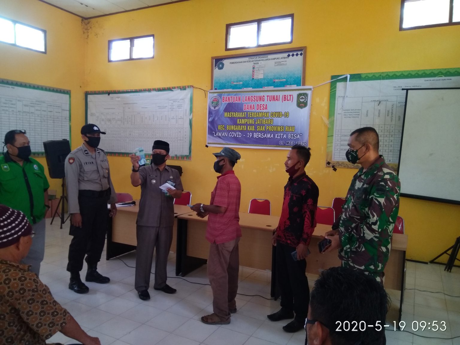 SIAK– Sebanyak 172 Kepala Keluarga (KK) warga Kampung Jatibaru yang terdampak Covid-19, menerima Bantuan Langsung Tunai (BLT) dari Anggaran Dana Kampung (ADK) tahap satu, Selasa (19/5/2020) di aula kantor penghulu kampung Jatibaru.