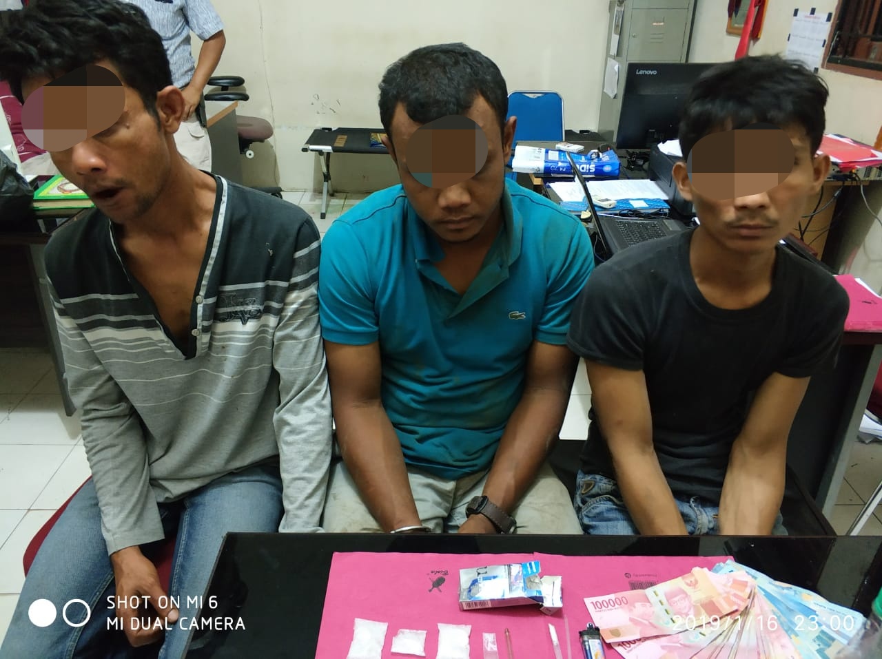 Ketiga tersangka kasus penyalahgunaan narkotika yang diciduk Aparat Kepolisian ini adalah MH alias MM (Lk 31) warga Desa Sei Pinang Kec. Tambang, MU aluas IM (Lk 38) warga Desa Tambang Kec. Tambang dan JE alias JN (Lk 31) warga Kelurahan Simpang Baru Kota Pekanbaru.