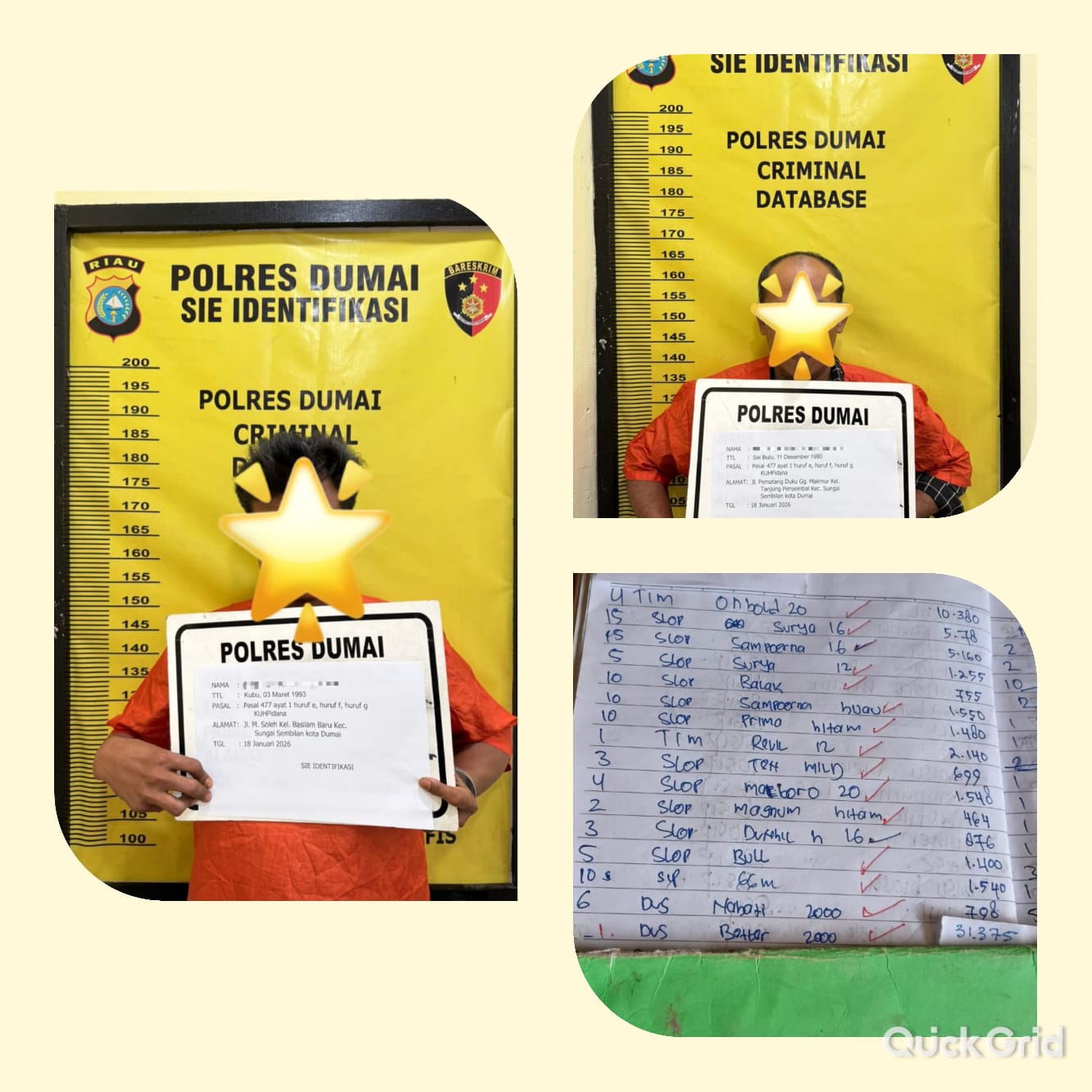 Setelah menerima laporan, tim opsnal Polsek Sungai Sembilan melakukan penyelidikan dan berhasil mendapatkan informasi terkait identitas pelaku. Pada tanggal 17 Januari 2026 pukul 21.00 WIB, pihak kepolisian melakukan penangkapan terhadap BU dan NG di kediaman mereka di Jalan Bunga, Kelurahan Tanjung Penyembal.