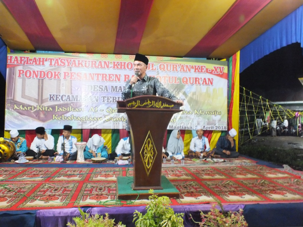TEBINGTINGGI BARAT.MANDIRIPOS.COM. Acara perpisahaan santri Pondok pesantren Rodhiatul Qur’an, Desa mantiasa Kecamatan Tebingtinggi Barat, selain diisi dengan Kegiatan Khatam Al-Qur’an juga dilaksanakan ceramah yang menghadirkan KH. Rahmad mubaligh dari Kota Dumai dan dihadiri Wakil Bupati kepulauan Meranti Drs H Said Hasyim.M.Si. .