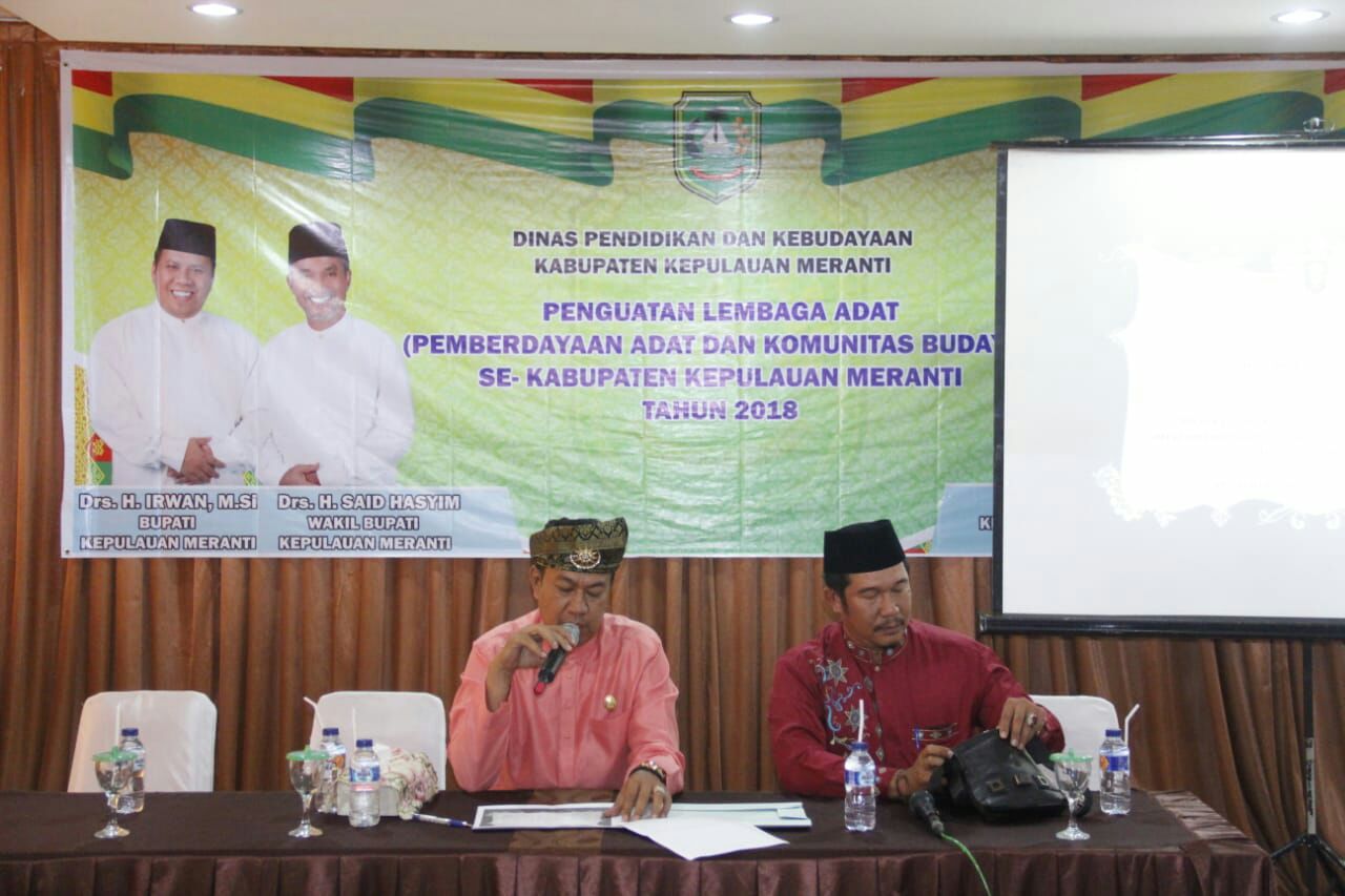 MERANTI,Mandiripos.com-Dalam rangka melakukan pemberdayaan Adat dan komunitas se-Kabupaten Kepulauan Meranti, Dinas Pendidikan dan kebudayaan Kabupaten Kepulauan meranti menggelar kegiatan penyuluhan penguatan lembaga adat. Acara tersebut dilaksanakan selama dua hari, bertempat di Ballroom Afifa Sport center.