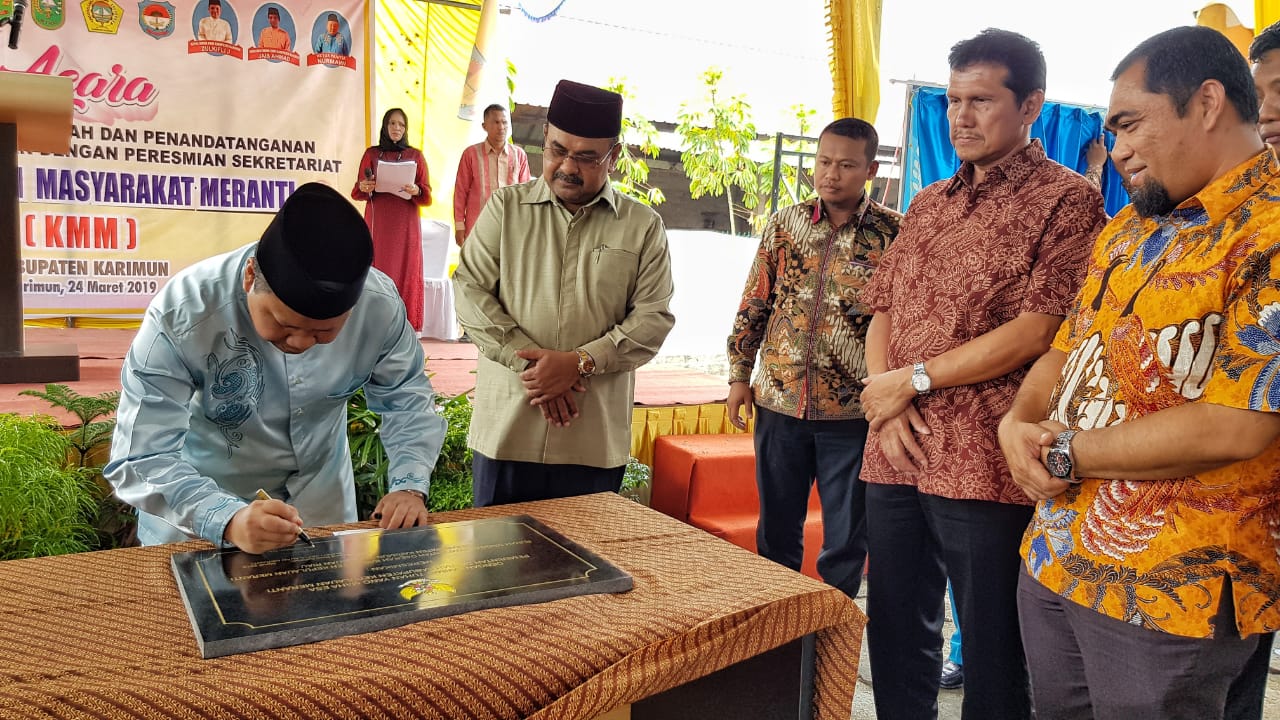 Karimun,Mandiripos.com-Bupati Meranti Drs. H. Irwan M.Si bersama Bupati Kabupaten Karimun H. Aunur Rafiq S.Sos M.Si, mengikuti kegiatan Syukuran Rumah Singgah Meranti di Karimun dan Penandatanganan Prasasti serta Peresmian Sekretariat Kekerabatan Masyarakat Meranti (KMM), bertempat di Rumah Singgah Meranti Karimun, Jalan Jend. Sudirman, Harjosari, Kec. Tebing, Kab. Karimun, Minggu siang (24/3/19).