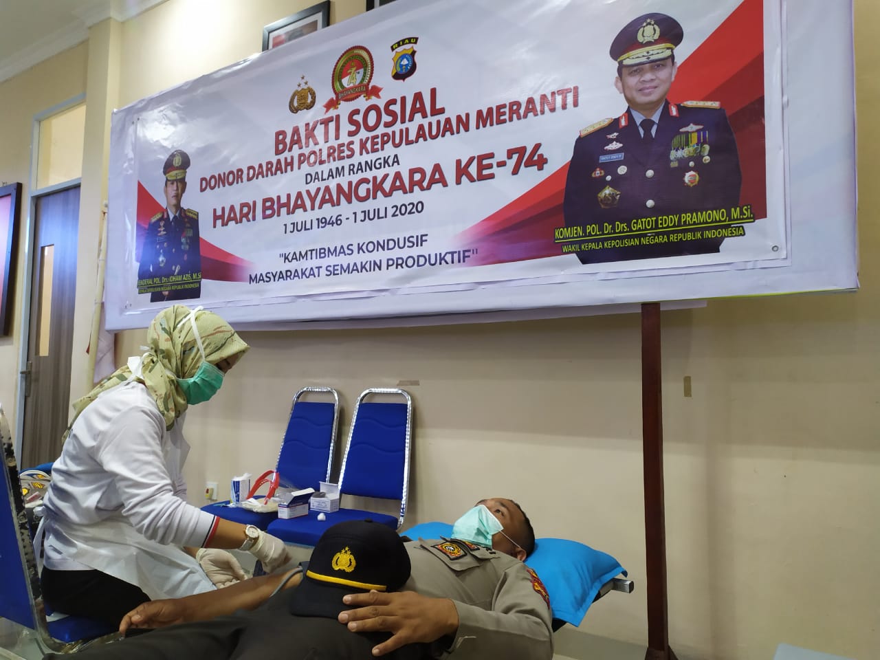 Meranti- Untuk membantu persedian Stok Darah di RS Umum Daerah Kabupaten Kepulauan Meranti, Polres Kepulauan Meranti adakan Kegiatan Bakti Sosial Donor Darah dalam rangka menyambut Hari Bhayangkara Ke 74, bertempat di Ruang Rupama Polres Kepulauan Meranti, Kamis (18/06/2020).