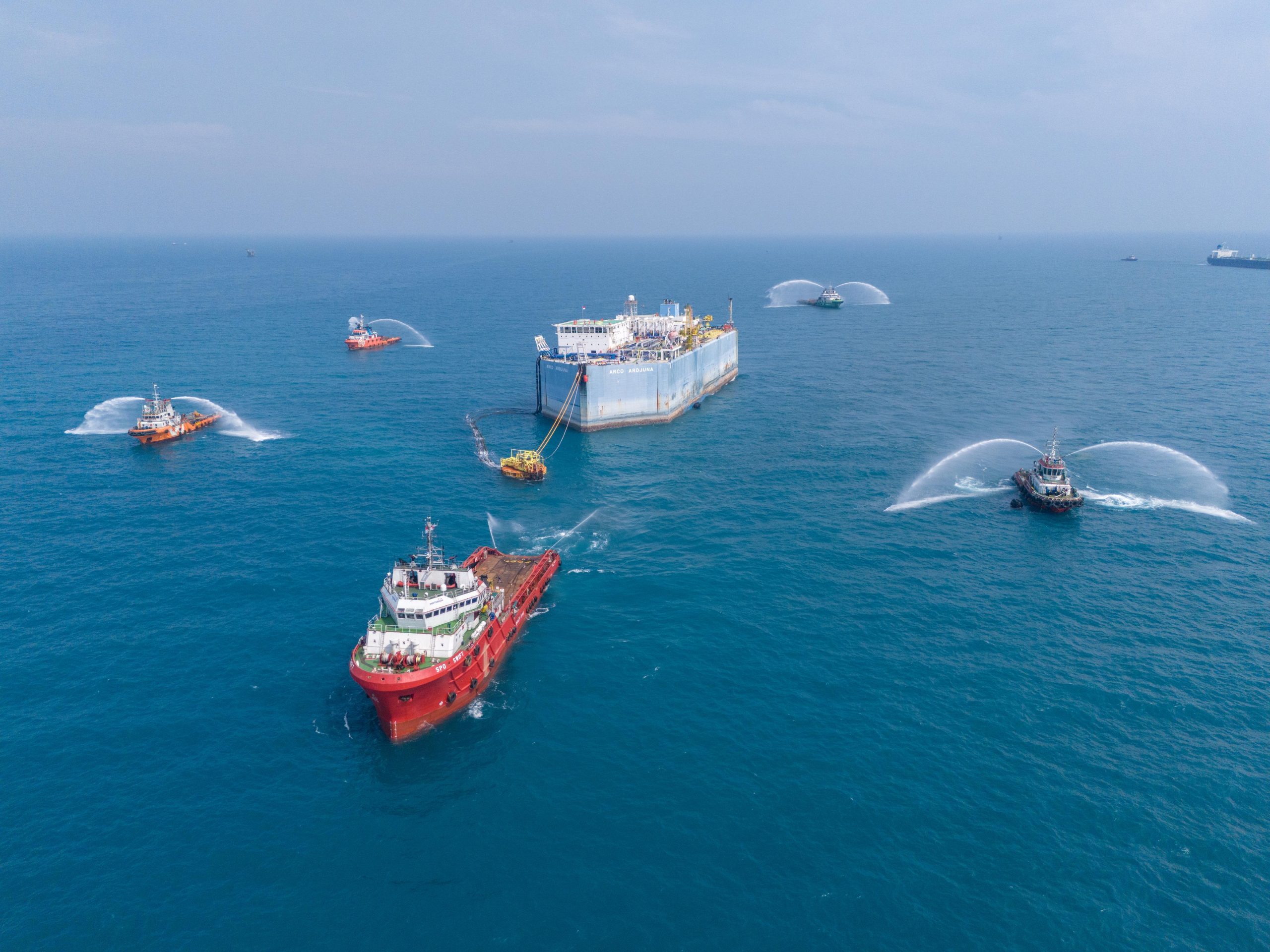 Lima kapal yang mengelilingi Arco Ardjuna merespons lengkingan itu dengan mengaktifkan sistem “Fifi”, atau firefighting. Semprotan air dari kapal-kapal ini dan lambaian tangan para kru pekerja mengiringi prosesi pelepasan FSO Arco Ardjuna.