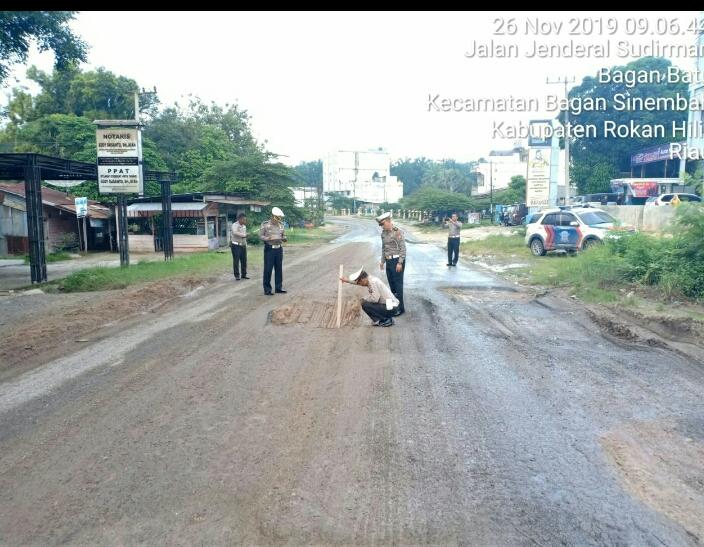 BAGAN BATU – Satuan Lalulintas Polsek Bagan Sinembah bersama tim Dit Lantas Polda Riau melakukan giat pemantauan Kondisi jalan rusak yang berpotensi menimbulkan kemacetan serta membahayakan pengguna jalan yang dipimpin oleh Kompol Efendi.