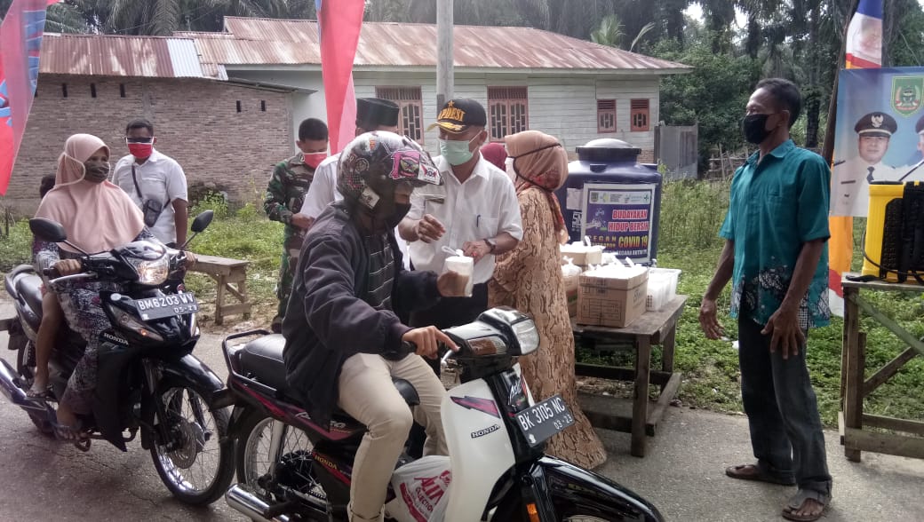 Pantauan di lokasi, Camat Basira, H M Yusuf MSI bersama Datuk Penghulu Harapan Makmur ikut langsung membagikan takjil kepada warga yang melintas.