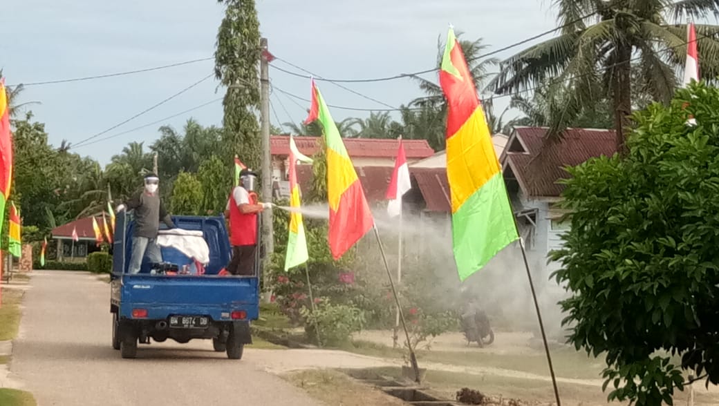 Pantauan di lapangan, Penyemprotan disinfektan itu dilakukan dengan menggunakan semprot mesin yang diangkut dengan menggunakan mobil pick up dan disaksikan langsung oleh Datuk Penghulu BSP, H Sutejo Spdi.