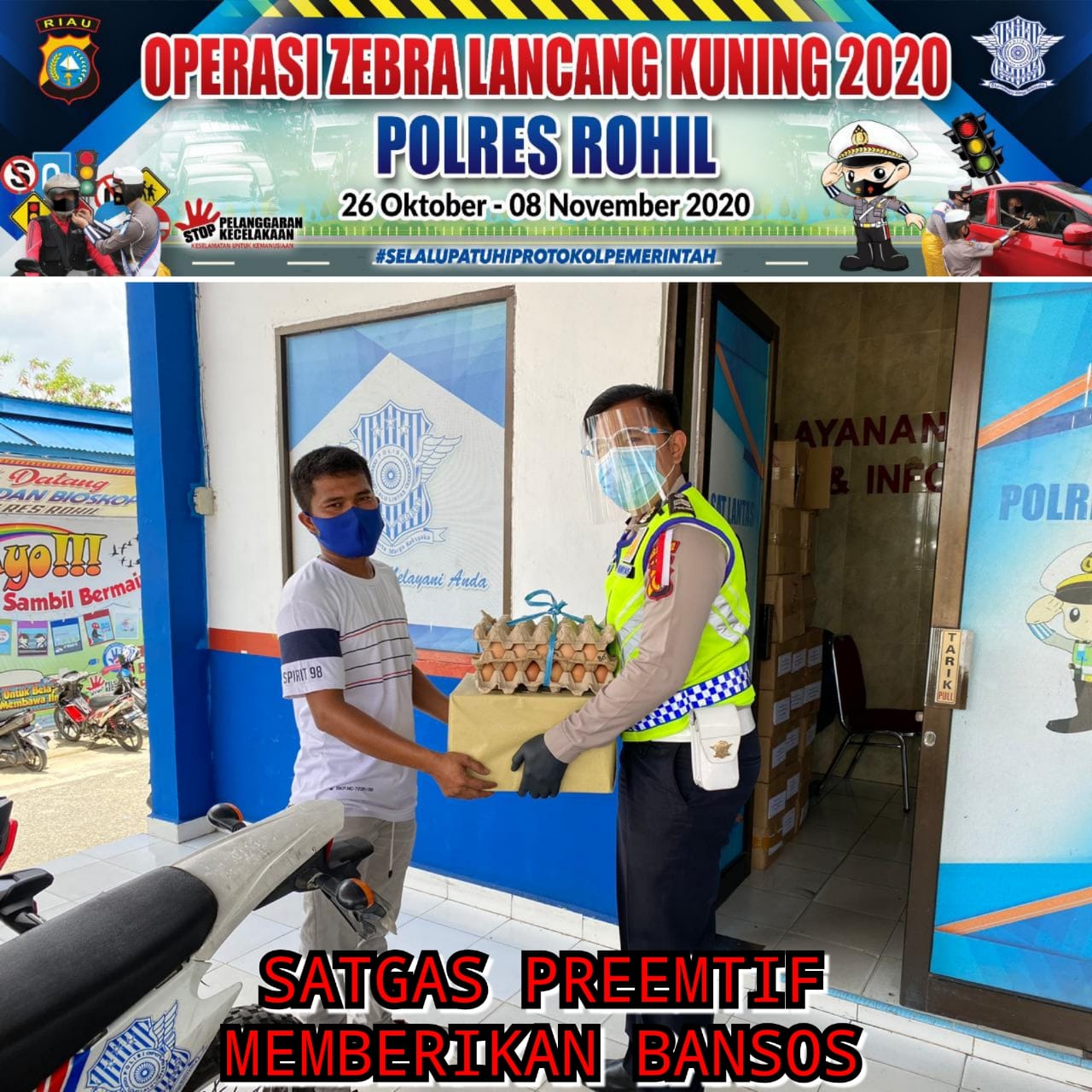 Kasatgas Preemtif Operasi Zebra Lancang Kuning 2020, Iptu Syaf Sandra SH, Kepada Mandiripos.com, Kamis (29/10/2020) mengatakan bahwa dalam kesempatan membagikan bansos tersebut pihaknya sekaligus mensosialisasikan kepada penerima bansos agar tertib berlalu lintas dan tetap menerapkan protokol kesehatan.