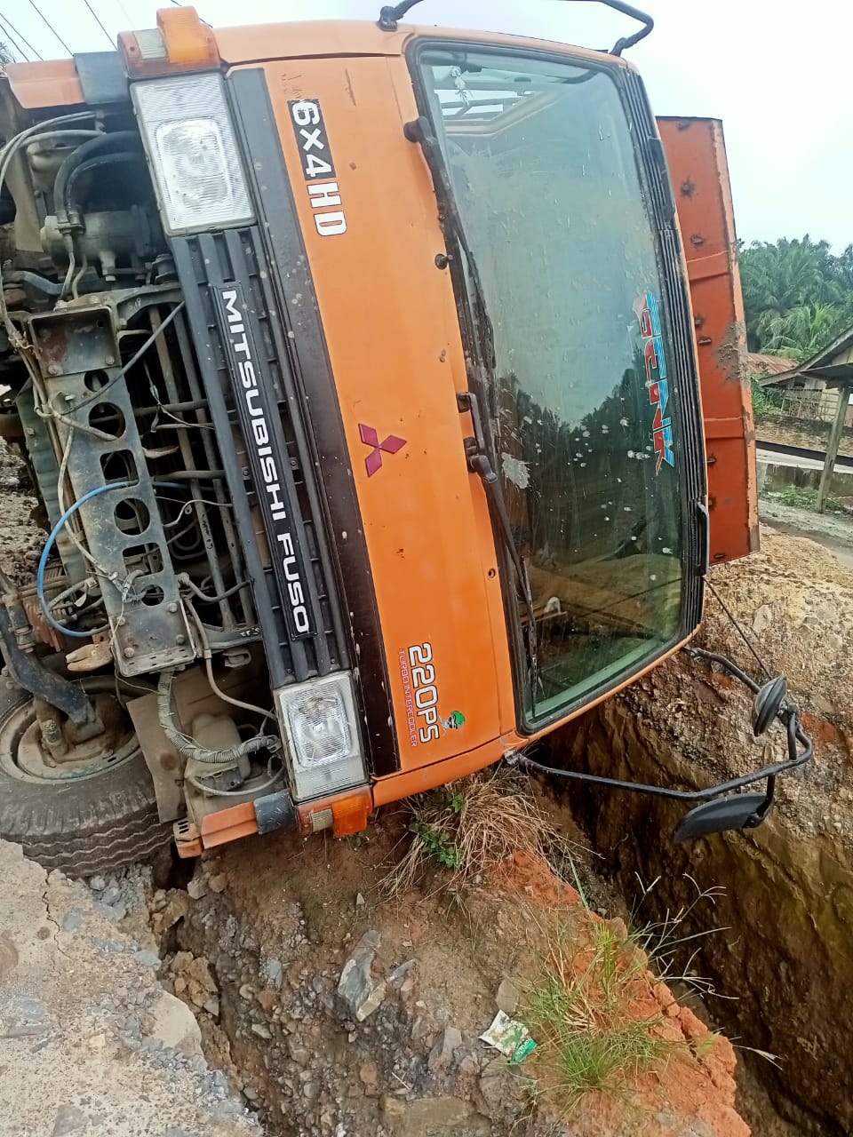 “Kejadian truk terguling ini sekitar tanggal 20 Desember 2020 kemarin, memang parah lah kalau sampai saat ini belum di evakuasi oleh pihak yang bersangkutan,” Katanya.