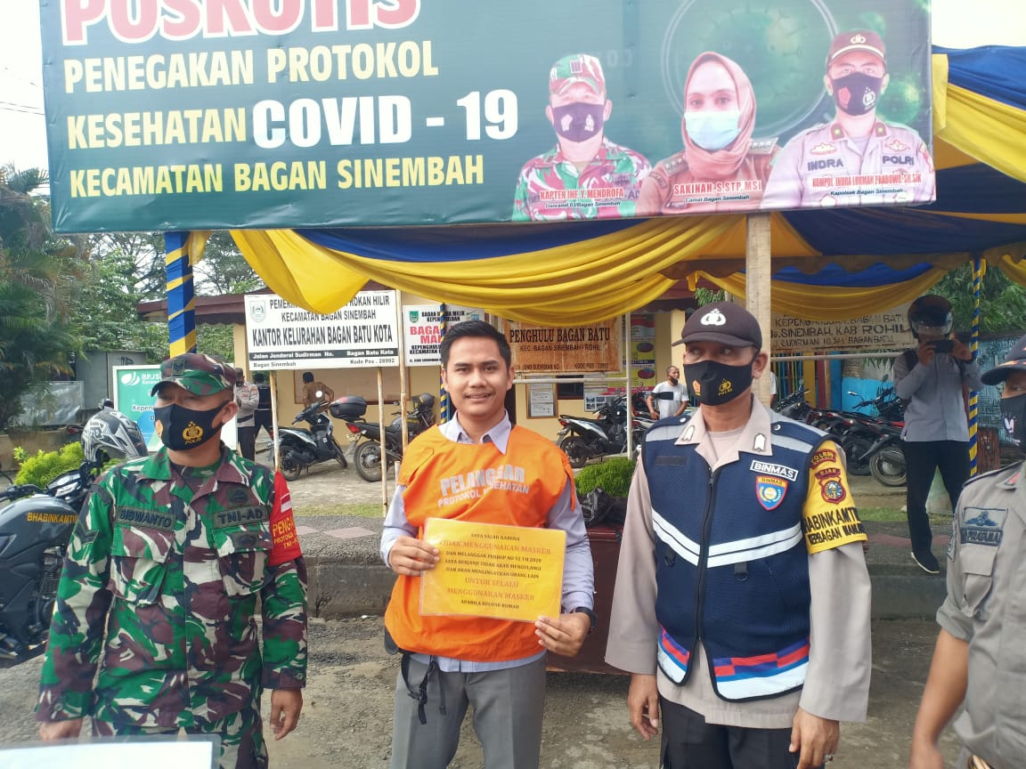 BAGAN BATU – Personil Kepolisian Sektor (Polsek) Bagan Sinembah, Polres Rokan Hilir bersama Koramil 03 Bagan Sinembah dan Pol PP Bagan Sinembah Melaksanakan Operasi Yustisi pemburu Teking Covid 19 secara Live Streaming melalui akun Dinas Poslek Bagan Sinembah.