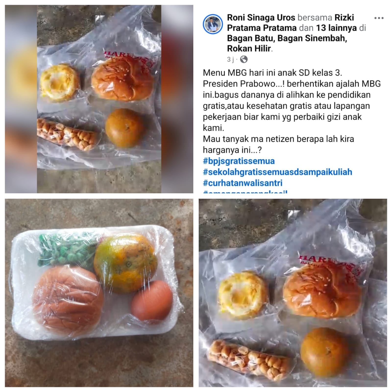 “Menu MBG hari ini anak SD kelas 3, Presiden Prabowo…! Berhentikan ajalah MBG ini, bagus dananya dialihkan ke pendidikan atau lapangan pekerjaan biar kami yang perbaiki gizi anak kami. Mau tanyak ma netizen berapalah kira-kira harganya ini…? Tulis Roni pada laman FB nya.