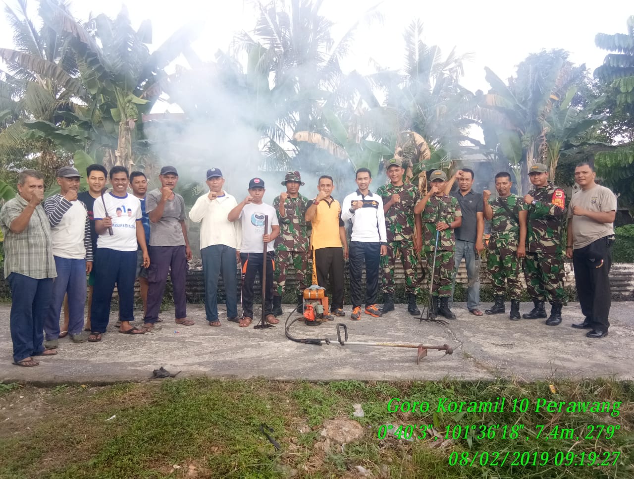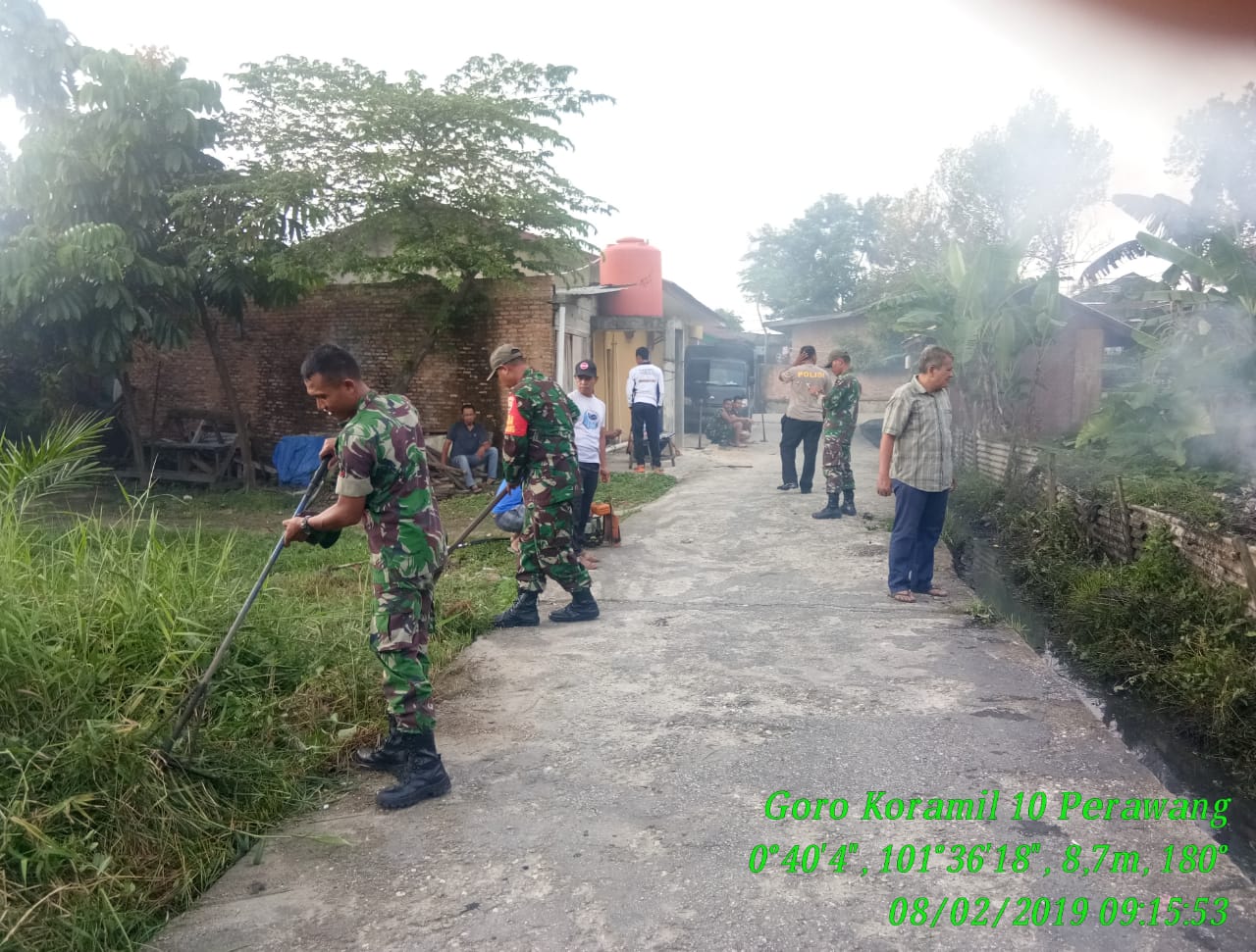 PERAWANG,Mandiripos.Com-Untuk pencegahan wabah DBD Pada hari Jum’at tanggal 08 Februari 2019 Pukul. 07.00 Wib s.d 10.30 Wib telah dilaksanakan kegiatam teritorial Gotong Royong Babinsa Koramil 10 Perawang bersama Personil Polsek dan Masyarakat Guna menjaga Kebersihan, Kesehatan dan mencegah mewabahnya Demam Berdarah (DBD), yang berlokasi di Depan Musholla Al-Fajar Jl. Panglima Gg. Fajar Rt. 011/002 Kelurahan Perawang kecamatan Tualang kabupaten Siak.