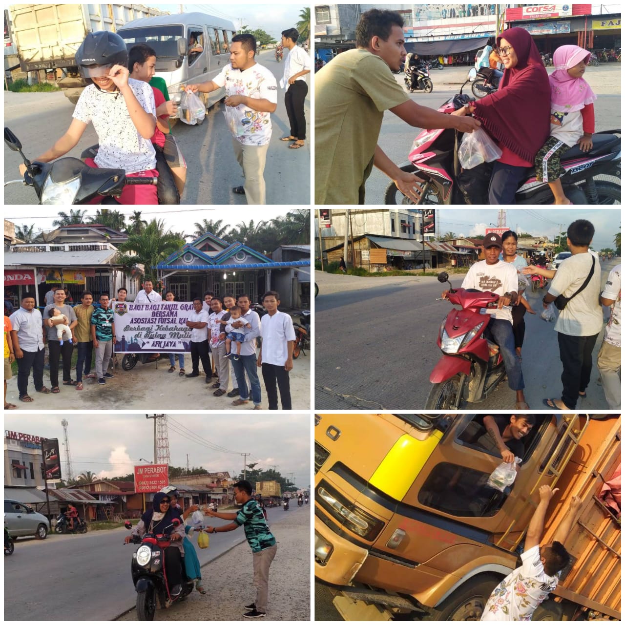 KANDIS,Mandiripos.com-Pengurus Asosiasi Futsal Kandis pada Selasa sore (21/5) turun ke jalan, tepatnya didepan Swalayan Fajar Km. 72 Kandis untuk membagikan sejumlah 250 paket Takjil untuk berbuka puasa kepada pengguna jalan dan masyarakat yang melintas. Sontak aksi bagi-bagi takjil ini menjadi perhatian warga atas kepedulian sesama oleh asosiasi futsal Kandis atau AFK ini.