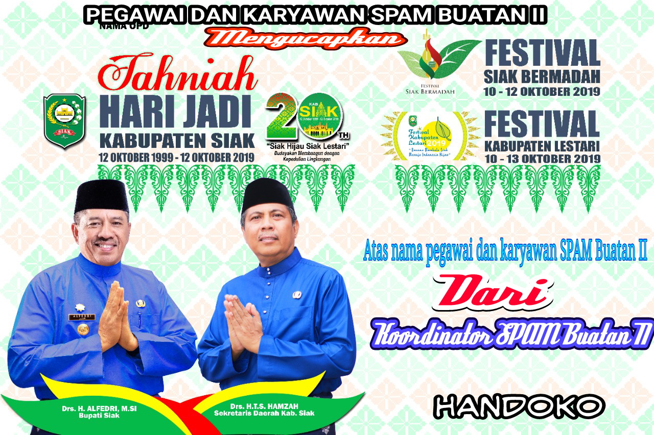 Pegawai dan Karyawan SPAM Buatan II Mengucapkan Tahniah Hut Kabupaten Siak ke 20FitriadiKamis , 10 Oktober 2019Siak494 Dilihat Total Pembaca: 494 Baca Juga Penghulu Kampung Sialang Sakti Mengucapkan Selamat Hut.Ke 5 Tahun Mandiripos.com Jangan LewatkanGelar Apel Sabuk Kamtibmas, Polres Siak Perkuat Sinergitas Dengan Seluruh Elemen Masyarakat Operasional Stockpile Cangkang, DLH Siak: Informasi Terkait KIMI ke PelindoPetani Menjerit! Proyek Sumur Bor Irigasi Miliaran di Siak Diduga Asal Jadi, Padi Warga MatiSekda Siak Pimpin Gotong Royong Bersama OPD di Taman Bawah Jembatan SiakSiswa SMP Islamic Center Siak Meninggal Dunia, Polisi Lakukan PenyelidikanMasa Aksi Geruduk Pelindo Perawang Tuntut PT KIMI Hentikan Operasional