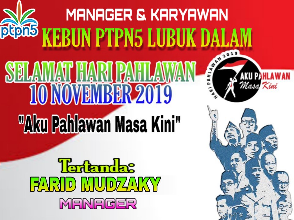 Manager dan Karyawan PTPN5 Kebun Lubuk Dalam Mengucapkan Selamat Hari PahlawanFitriadiMinggu , 10 November 2019Siak573 Dilihat Total Pembaca: 573 Baca Juga Dewan.Kerusakan Jalan DiBunga Raya Harus segera di Perbaiki Jangan LewatkanGelar Apel Sabuk Kamtibmas, Polres Siak Perkuat Sinergitas Dengan Seluruh Elemen Masyarakat Operasional Stockpile Cangkang, DLH Siak: Informasi Terkait KIMI ke PelindoPetani Menjerit! Proyek Sumur Bor Irigasi Miliaran di Siak Diduga Asal Jadi, Padi Warga MatiSekda Siak Pimpin Gotong Royong Bersama OPD di Taman Bawah Jembatan SiakSiswa SMP Islamic Center Siak Meninggal Dunia, Polisi Lakukan PenyelidikanMasa Aksi Geruduk Pelindo Perawang Tuntut PT KIMI Hentikan Operasional