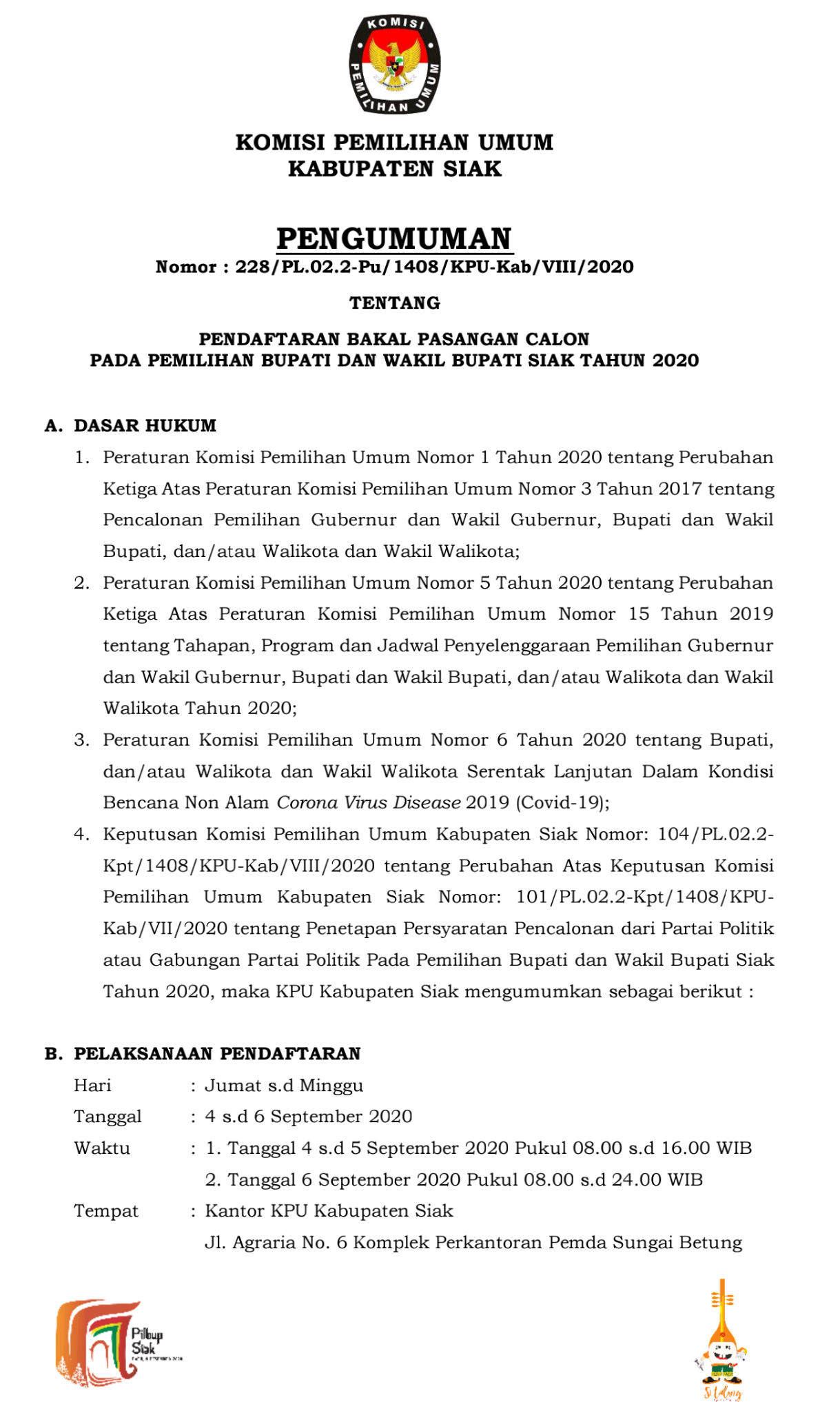 Pengumumam Pendaftaran Paslon Pilbub Siak 2020FitriadiJumat , 28 Agustus 2020Politik, Siak461 Dilihat Total Pembaca: 461 PENCALONAN Pilbup Siak 2020 PENGUMUMAN PENDAFTARAN PASLON TTD Baca Juga Buka MTQ tingkat Kampung Perawang Barat, ini Harapan Husni. Jangan LewatkanHari Bumi 2026, Kapolres Siak Ajak Generasi Z Jaga Kelestarian Alam Melalui Program Green PolicingHumanis dan Sigap, Kasat Reskrim Polres Siak Hadir untuk Korban di Tengah PenyelidikanKetua PWRI Kab.Siak Pertanyakan Kebebasan Pers, Wartawan Dibatasi Saat Peresmian Galangan Kapal MNS di KITB.Senin, 20 April 2026.PT Arara Abadi Diduga Ingkar Janji, Warga Blokir Jalan Doral Hentikan Truk LoggingKetua IWO Siak Sesalkan Dugaan Pembatasan Wartawan, Kebebasan Pers Dipertanyakan di Peresmian Galangan Kapal MNSGelar Apel Sabuk Kamtibmas, Polres Siak Perkuat Sinergitas Dengan Seluruh Elemen Masyarakat