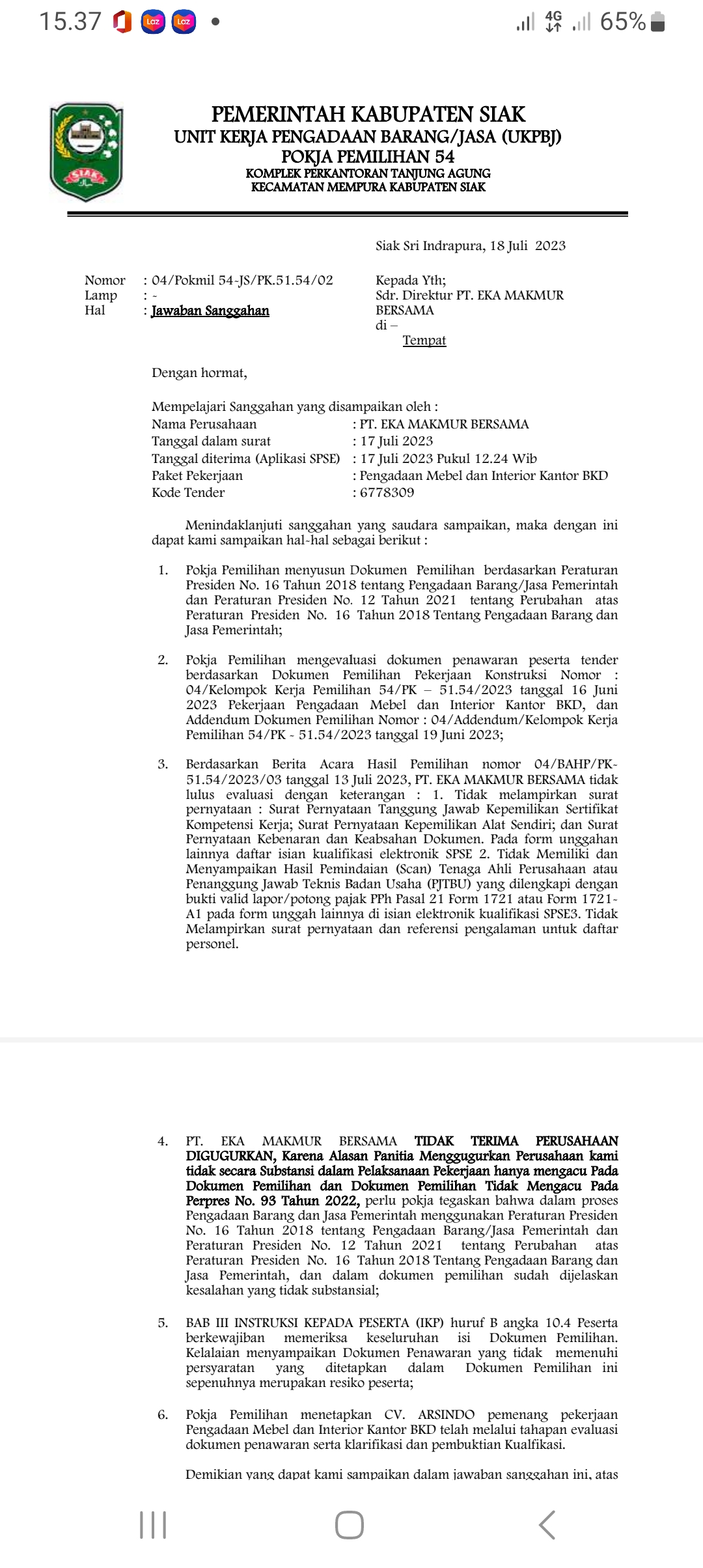 4. PT. EKA MAKMUR BERSAMA TIDAK TERIMA PERUSAHAAN DIGUGURKAN, Karena Alasan Panitia Menggugurkan Perusahaan kami tidak secara Substansi dalam Pelaksanaan Pekerjaan hanya mengacu Pada Dokumen Pemilihan dan Dokumen Pemilihan Tidak Mengacu Pada Perpres No. 93 Tahun 2022, perlu pokja tegaskan bahwa dalam proses Pengadaan Barang dan Jasa Pemerintah menggunakan Peraturan Presiden No. 16 Tahun 2018 tentang Pengadaan Barang/Jasa Pemerintah dan Peraturan Presiden No. 12 Tahun 2021 tentang Perubahan atas Peraturan Presiden No. 16 Tahun 2018 Tentang Pengadaan Barang dan Jasa Pemerintah, dan dalam dokumen pemilihan sudah dijelaskan kesalahan yang tidak substansial;