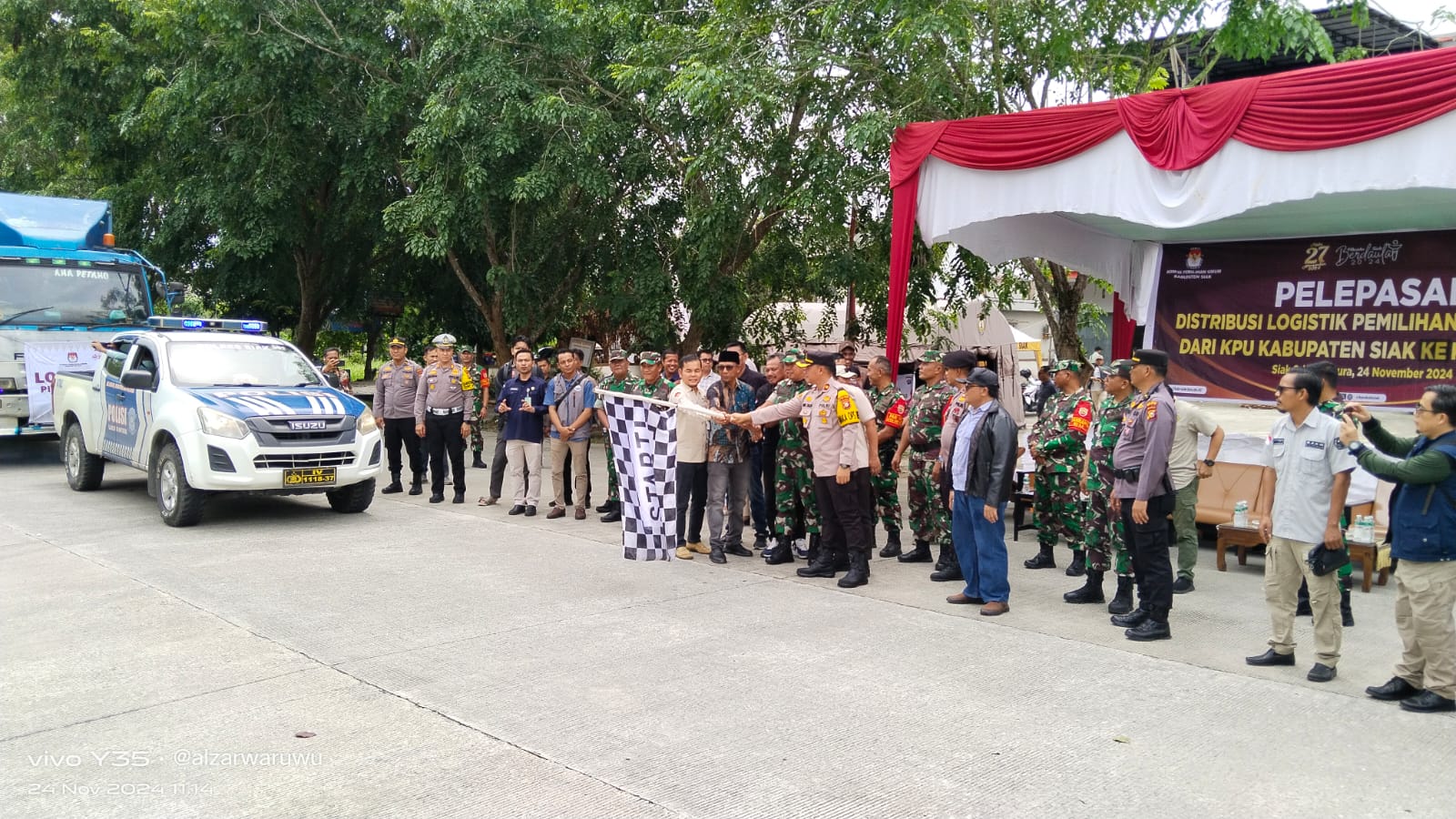 Ketua KPU Kabupaten Siak Said Dharma Setiawan dalam sambutannya, sangat berterimakasih kepada seluruh jajaran TNI dan Polri beserta Bawaslu Kabupaten Siak yang sudah mendukung berbagai tahapan jelang pelaksanaan Pilkada di Kabupaten Siak, hingga pendistribusian logistik sampai ke Kecamatan-Kecamatan se- Kabupaten Siak yang dilaksanakan hari ini.