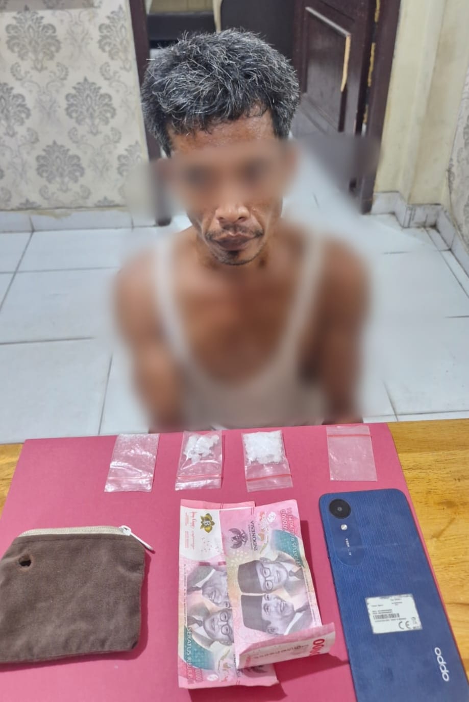 Tersangka yang berhasil diamankan adalah EL (39). Dari tangan pelaku, petugas berhasil menyita sejumlah barang bukti, antara lain 3 (tiga) paket narkotika jenis shabu dengan berat kotor 7,52 gram, 1 (satu) buah plastik klip bening, 1 (satu) unit handphone merek Oppo, 2 (dua) lembar uang pecahan Rp100.000,-, 1 (satu) buah dompet warna cokelat, dan 1 (satu) unit sepeda motor Honda Beat dengan nomor polisi BM 2704 XX.
