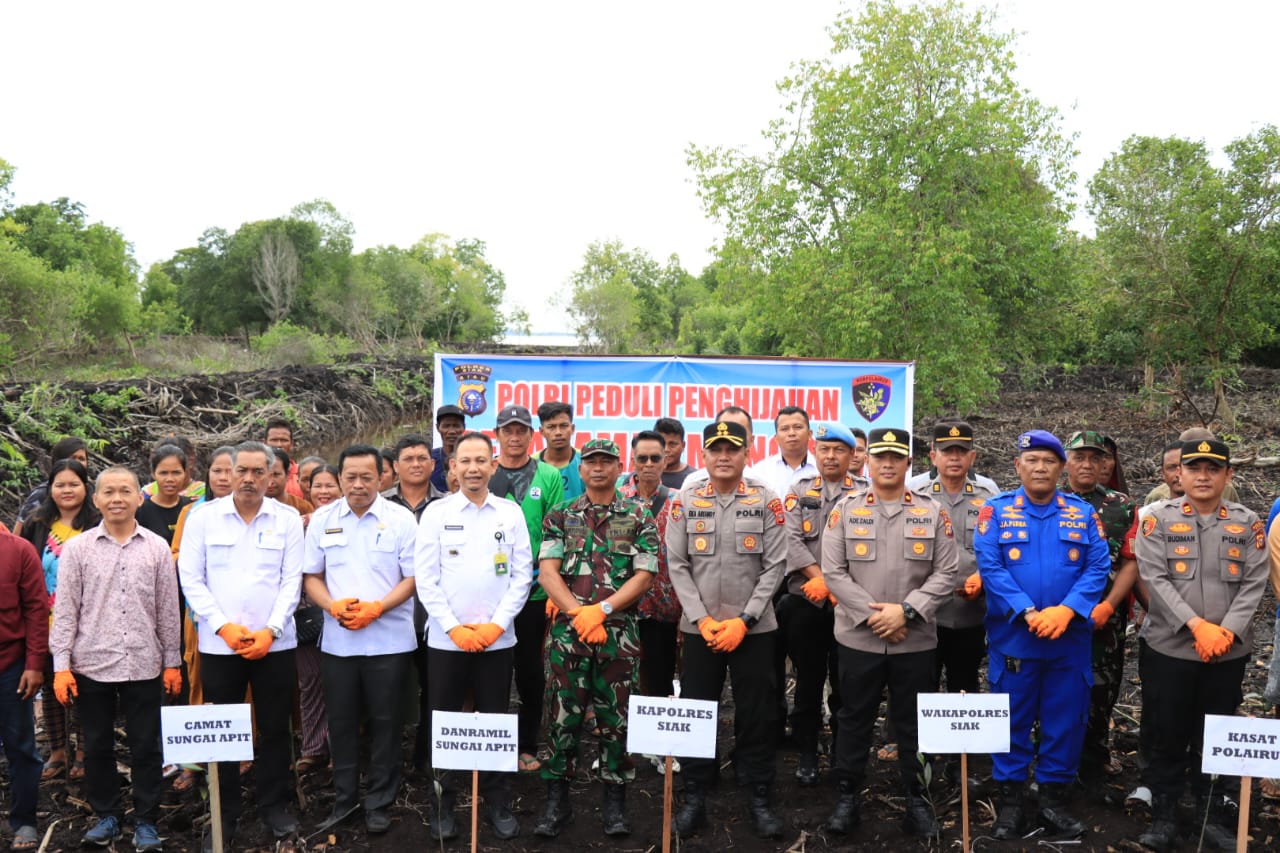 SIAK– Dalam upaya memperkuat pengamanan perairan sekaligus menjaga kelestarian lingkungan, Polres Siak meresmikan Pos Sandar Polairud Tanjung Pal di Kampung Penyengat, Kecamatan Sungai Apit, Rabu (13/8/2025). Acara peresmian dipimpin langsung oleh Kapolres Siak, AKBP Eka Ariandy Putra, S.H, S.I.K, M.Si, dan dilanjutkan dengan penanaman bibit pohon mangrove sebagai bagian dari program Green Policing.