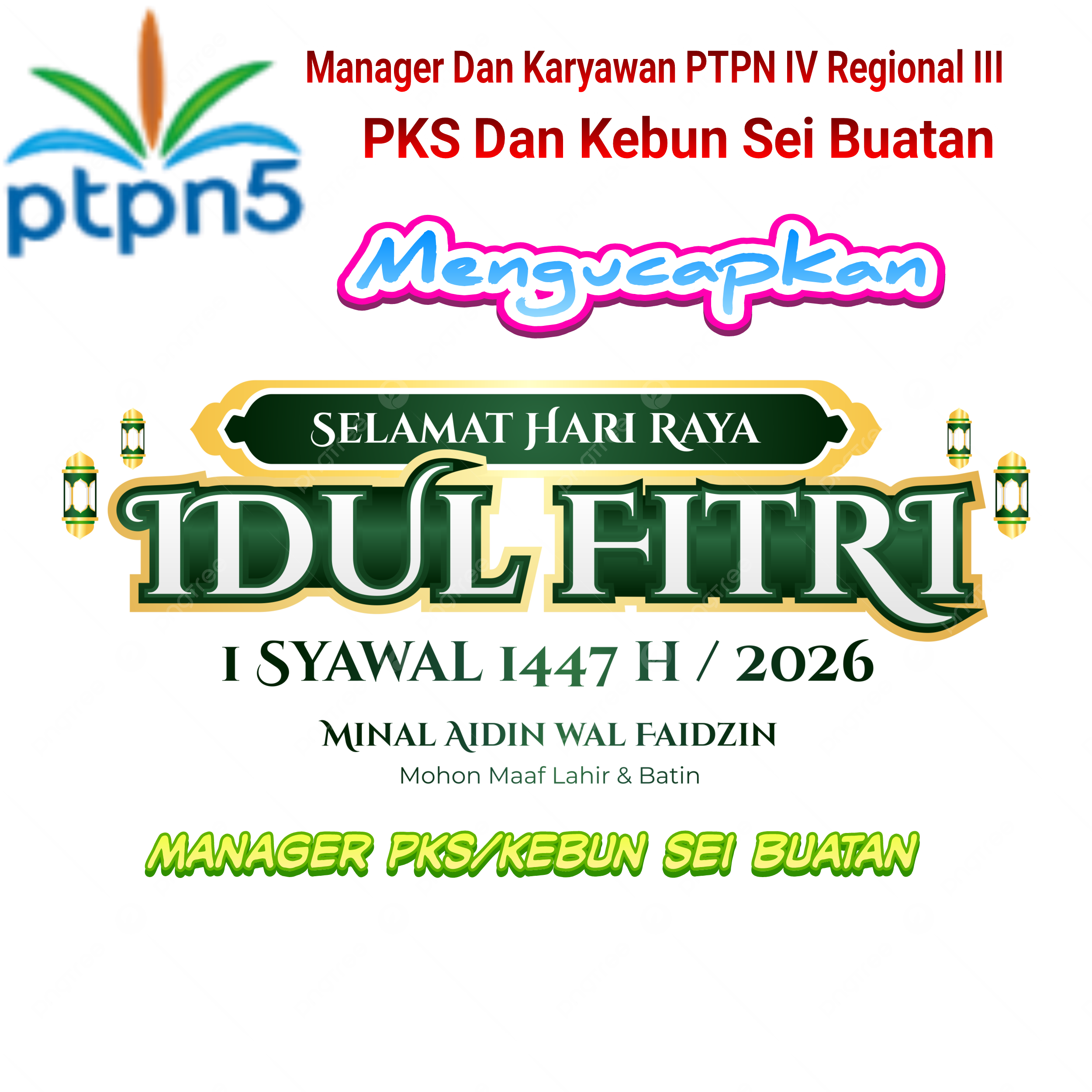 Manager Dan Karyawan PTPN IV Regional III Sei Buatan Mengucapkan Selamat Hari Raya Idul Fitri 1447 H -2026 Mohon Maaf lahir dan BatinFitriadiJumat , 20 Maret 2026Siak2778 Dilihat Total Pembaca: 2,778 Baca Juga Mengunakan dana pusat Tangsi Belanda di restorasi Jangan LewatkanPelabuhan Tanjung Buton di Padati Penumpang Arus Balik , Polisi Intensifkan Penggamanan.PT Musim Mas Pel Buatan II Mengucapakan Selamat Hari Raya Idul Fitri 1447 H-2026 MBupati Siak Tolak Permohonan HGU PT WSSI: Diduga Abaikan Aturan Sejak 2001.Pemkab Siak Terapkan Blokir Anggaran Non-Prioritas dan WFA Mulai April 2026Momen Puasa Rhomadhan UPTD Puskesmas Sungai Apit gelar buka bersama dan santuni anak yatim.Perkuat Sinergi Pengamanan Idulfitri, Bupati Siak Hadiri Rakor Operasi Lancang Kuning 2026