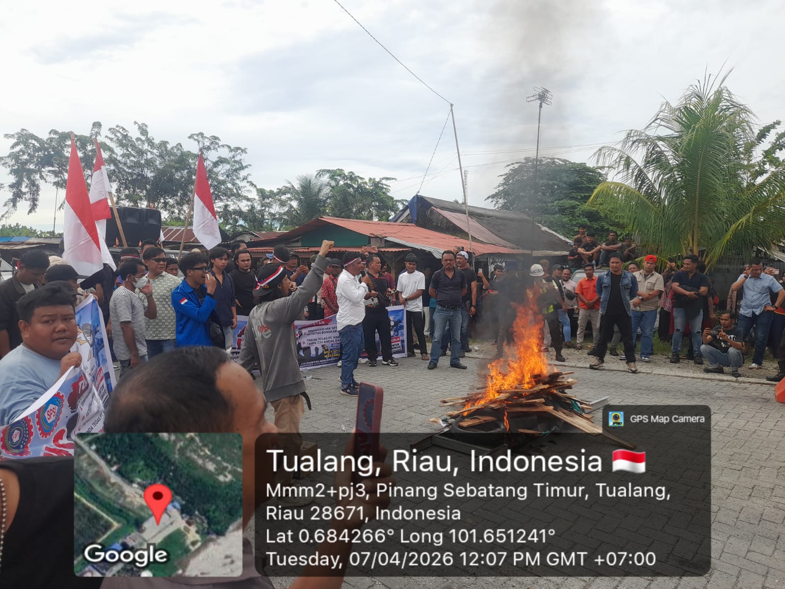 SIAK – Masa aksi geruduk PT Pelabuhan Indonesia (Pelindo) Regional 1 Terminal Petikemas Perawang Riau, Tualang, Pinang Sebatang Timur, meminta agar aktifitas operasional PT KIMI diberhentikan, Selasa (7/4/2026).