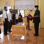 SIAK-Bupati Siak Alfedri menyerahkan potongan tumpeng kepada Datuk Wirakusuma Negeri yang juga selaku penghulu kampung