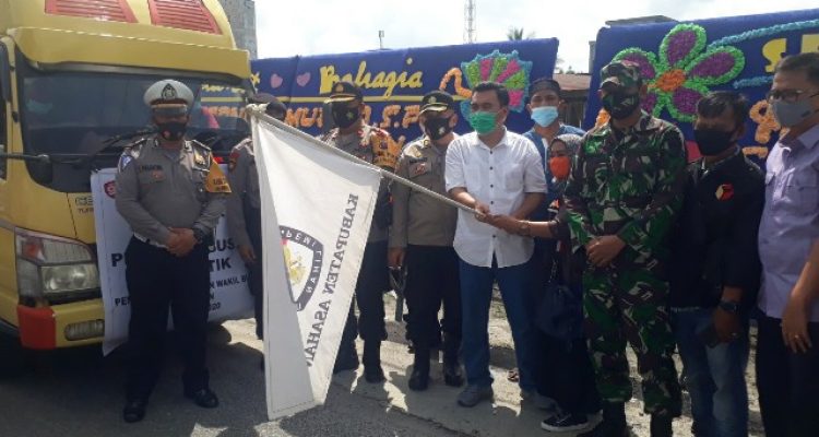 ASAHAN – KPUD Kabupaten Asahan beserta Asisten II Pemkab Asahan dan perwakilan TNI-Polri melepaskan pendistribusian logistik