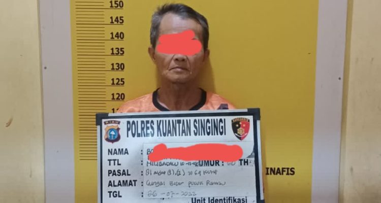KUANTAN SINGINGI – Satreskrim Polres Kuantan Singingi amankan tersangka dugaan pencabulan anak bernama inisial V