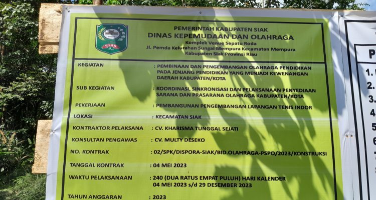 SIAK ,Mandiripos.com- Pengerjaan salah satu proyek di Dinas Pemuda dan Olahraga (Dispora) pemerintah Daerah Kabupaten Siak, tanpa menyebutkan jumlah Anggarannya pada papan informasi kegiatan yang telah dipasang disinyalir ada unsur kesengajaan. Praktik semacam ini membuka pintu terjadinya tindakan korupsi.