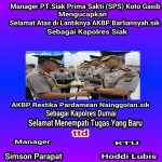 Manager PT SPS Mengucapkan Selamat Atas DiLantiknya AKBP Barliansyah.Sik Sebagai Kapolres Siak Siak|Minggu , 24 September 2017Minggu , 24 September 2017oleh Fitriadi Pemerintahan Kampung Sri Gemilang Mengucapkan Selamat Atas DiLantiknya AKBP Barliansyah.Sik Sebagai Kapolres Siak Pemerintahan Kampung