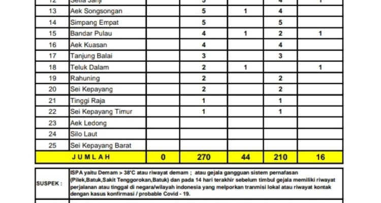 Asahan – 6 Warga Asahan kembali sembuh dan 1 orang terkonfirmasi Virus Covid-19, dari 270