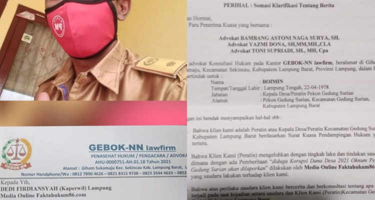 Kuasa Hukum Peratin, Somasi Pemberitaan di Salah Satu Media Online di Lampung Barat Nasional, News|Selasa , 27 September 2022oleh Fitriadi Liwa. Mandiri Pos-Terkait dengan pemberitaan salah satu media online di Lampung Barat dengan judul, “Oknum