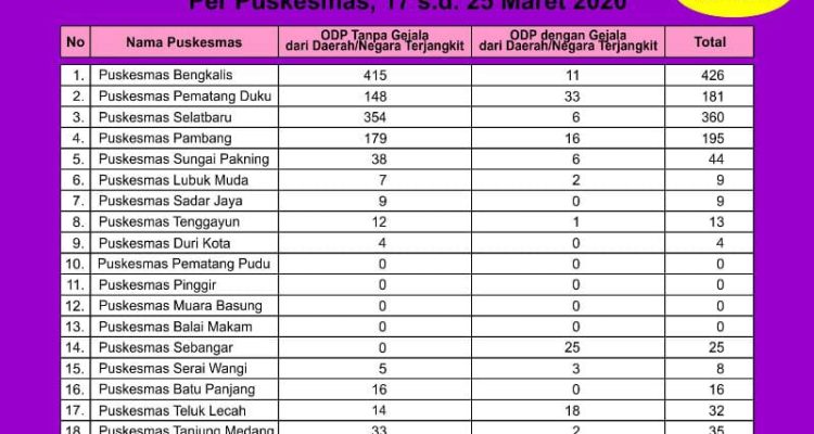 BENGKALIS – MANDIRI POS, Jumlah Orang Dalam Pemantauan (ODP) di Kabupaten Bengkalis dari 17 s.d.