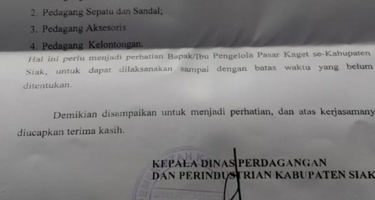 SIAK- Pemerintah Daerah (Pemda) Kabupaten Siak melalui Dinas Perdagangan dan Perindustrian (Disdagperin) telah mengeluarkan surat