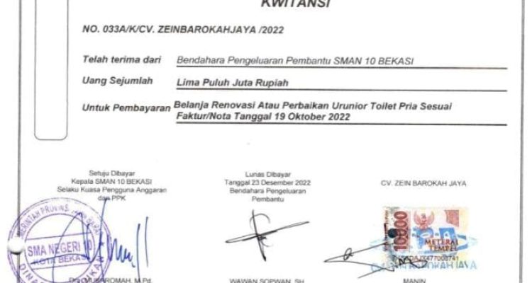 Mandiri Pos (Kota Brkasi) — Penggunaan anggaran SMA Negeri 10 Kota Bekasi, Provinsi Jawa Barat