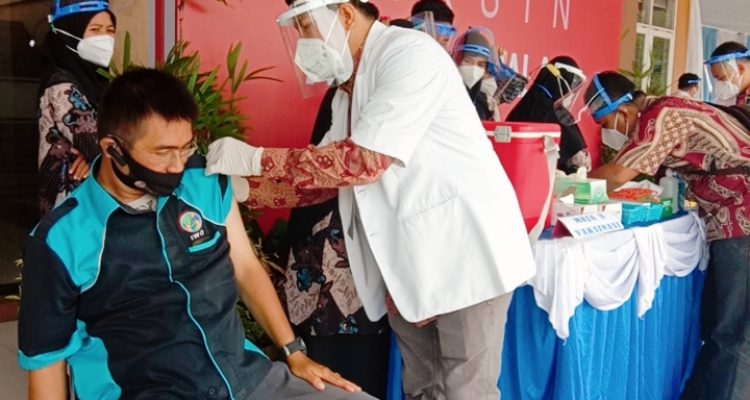 SIAK-Untuk vaksin pertama sekretaris ikatan wartawan online ( IWO) kabupaten siak donni dofiandi disuntik vaksin