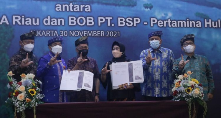 JAKARTA-Bupati Siak Alfedri menyaksikan penandatanganan Perjanjian Kerja Sama (PKS) pengelolaan Taman Nasional Zamrud, antara BOB