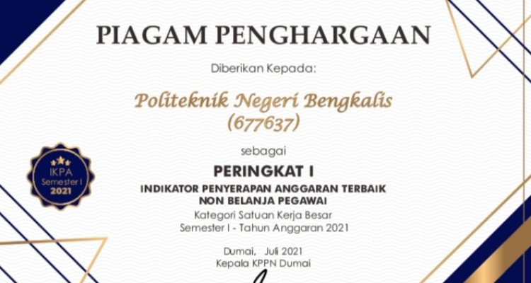 BENGKALIS – MANDIRI POS, Politeknik Negeri Bengkalis (Polbeng) memperoleh penghargaan dari Kantor Pelayanan Perbendaharaan Negara
