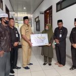 Siak–Bupati Siak Alfedri didampingi Komisioner Badan Amil Zakat Nasional (BAZNAS) kabupaten Siak Samparis menyerahkan bantuan