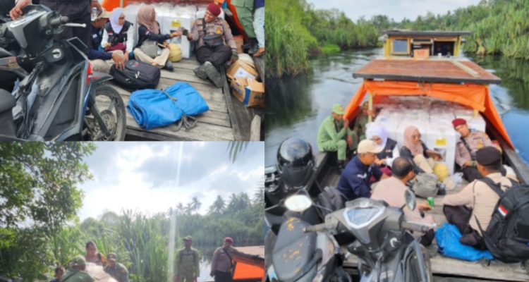 Polsek Siak Kecil Distribusikan Logistik Pemilu Gunakan Pompong