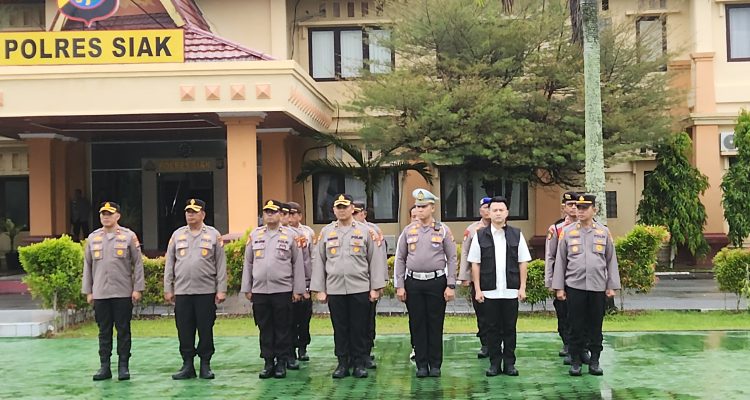 SIAK– Kapolres Siak, AKBP Eka Ariandy Putra, S.I.K., M.Si., memimpin apel pagi perdana sejak menjabat